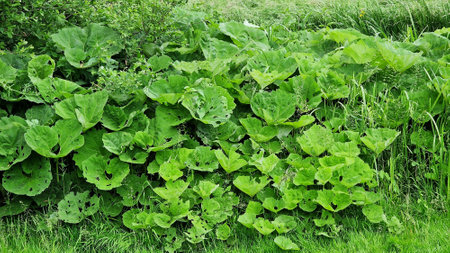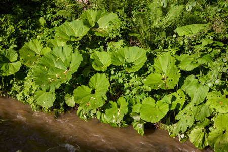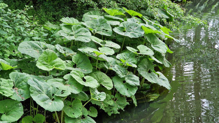 Petasites japonicus Gigantea or Giant Japanese Coltsfoot plant, growing on the bank of a canal.