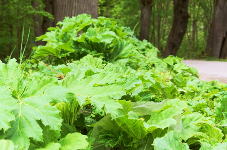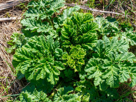 the poisonous weed heraculum sosnowskyi in the spring. Green leaves, plant, poisonous, tubular. A global problem.