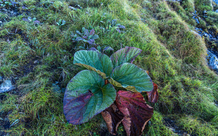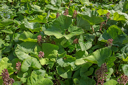 leaves of butterbur or pestilence wort. Petasites hybridus, the butterbur, is a herbaceous perennial flowering plant in the daisy family Asteraceae, native to Europe and northern Asia.