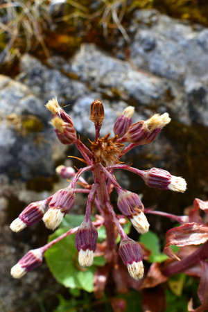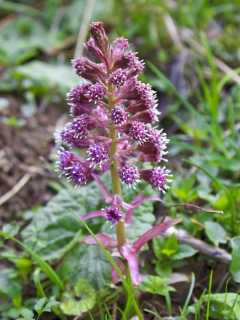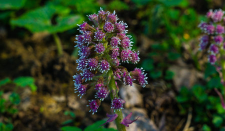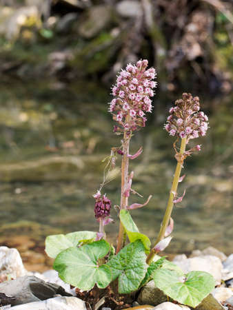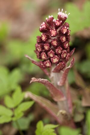 Purple blossom of the common butterbur, also called Petasites hybridus or Gewoehnliche Butterbur