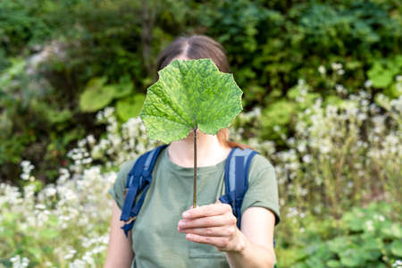 Young woman holding a green burdock leaf in her hand in front of her face in forest faceless anonymous psychological concept mockup