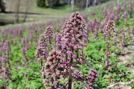 Petasites hybridus flower growing in meadow, close up shoot