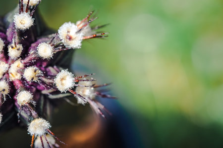 Text space with Macro close up half of the top of cactus, have some water drop on thorns and flora of it