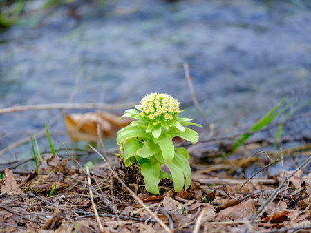 The unusual emerging flowers of Petasites japonicus also known as Fuki, Bog rhubarb, Japanese sweet coltsfoot or Giant Butterbur, growing in a natural wetland setting.