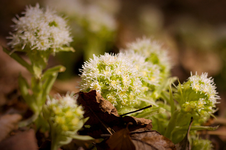 White Butterbur - Petasites albus blooming in the forest