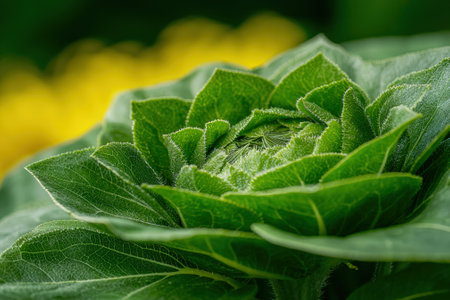Unopened sunflower bud displaying vibrant green leaves.