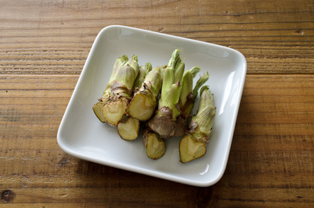 Harvested green butterbur sprouts in the plate on wooden board