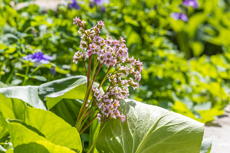 Beautiful pink Bergenia cordifolia or also called Badan (Saxifragaceae,) in full bloom during spring in castle garden of Verhildersum in The Netherlands