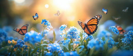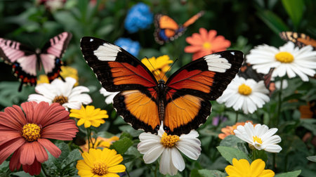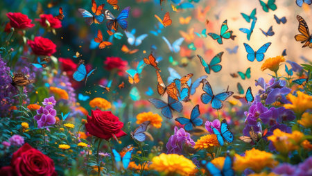 Vibrant butterflies soar above colorful flowers in a serene garden setting during a sunny afternoon