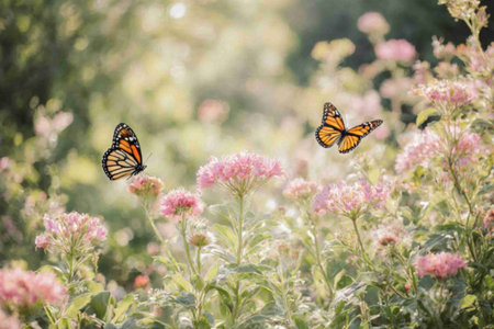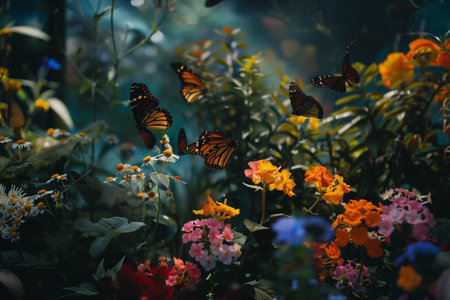 Monarch butterflies flutter among blooming flowers in a lively garden filled with colors and sunlight.