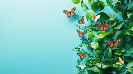 Beautiful green leaves and orange butterflies on blue background