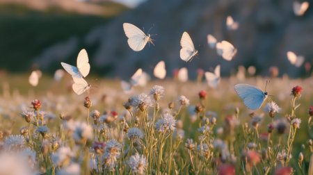 A captivating scene featuring delicate butterflies fluttering above a vibrant flower field, showcasing the beauty of nature in a serene and picturesque landscape.