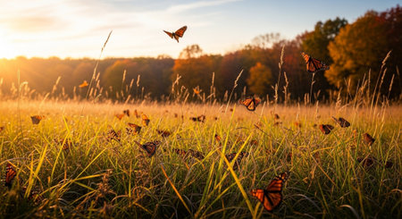 Sunlit meadow with monarch butterflies among wildflowers at sunset. That the image is generated using AI.