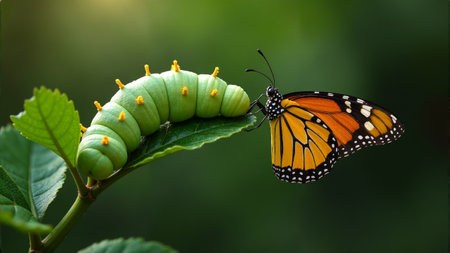 Vibrant green leaf serves as a backdrop for a mesmerizing metamorphosis as a caterpillar undergoes a magical transformation into a delicate, intricately patterned butterfly.