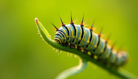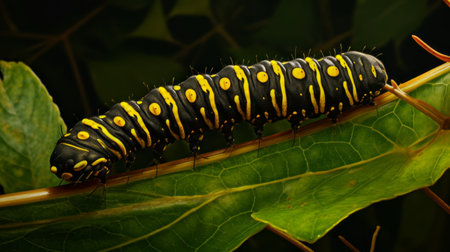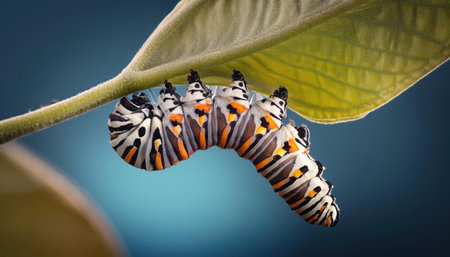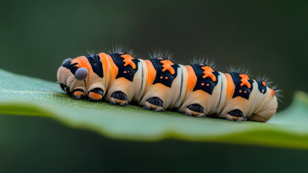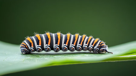 A vibrant caterpillar resting on a lush green leaf creates a striking image of nature's detail and beauty, showcasing the life cycle of these fascinating creatures.