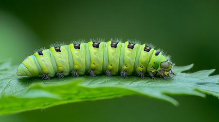 Close-up of a caterpillar munching on a green leaf, showcasing its segmented body