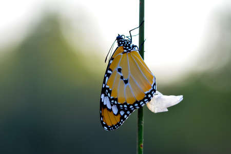 Closeup beautiful Monarch Butterfly and Chrysalis. Concept transformation of Butterfly