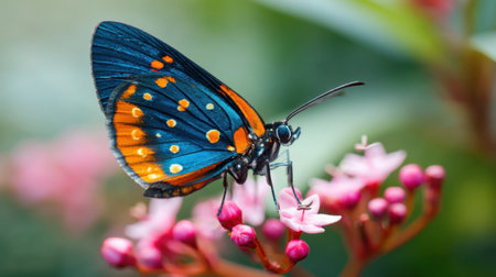 A beautiful butterfly rests on a vibrant flower, captured in a stunning moment in nature. The intricate details of the butterfly's wings and the delicate petals of the flower create a mesmerizing scene. Perfect for nature lovers and those who appreciate the beauty of the natural world , Ai Gennerated