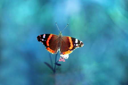 Vibrant butterfly with detailed wings, showcasing a beautiful combination of orange, red, and black markings. The butterfly's wings are spread and display a intricate pattern. Its delicate texture is clearly visible. The image is a close-up, highlighting the textures and intricate patterns.