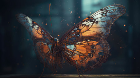 Steampunk butterfly with rusted orange metal wings and exposed brass gears arranged like a mechanical engine, set against a dark industrial background with warm directional lighting and intricate metalwork details