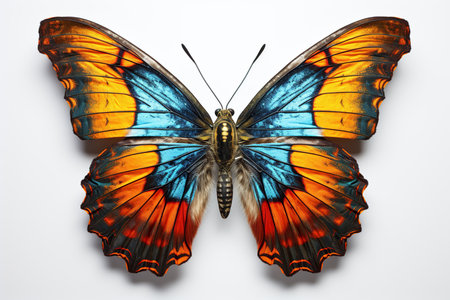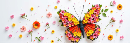 Colorful floral butterfly design with various blossoms on white background. That the image is generated using AI.