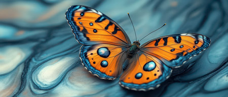 A vibrant orange butterfly rests on a uniquely patterned surface with swirling blue and gray hues.