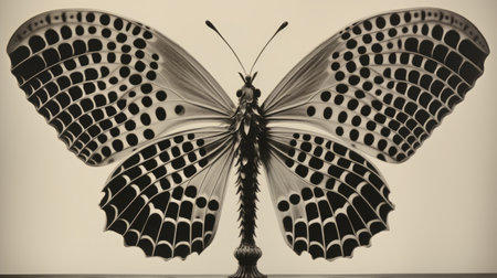 a black and white butterfly gracefully perches on a metal pole, creating a captivating realist still life. the intricate dotwork technique adds depth and texture to the image, reminiscent of the artistic styles of jun kaneko and george platt lynes. this large-scale painting beautifully captures the symmetry and detailed depictions of animals. ai generated