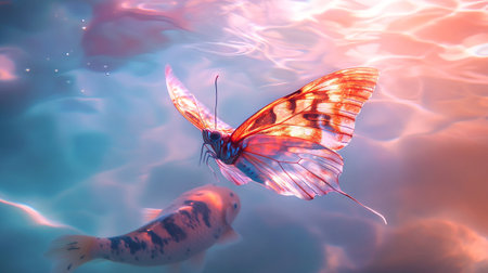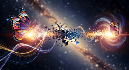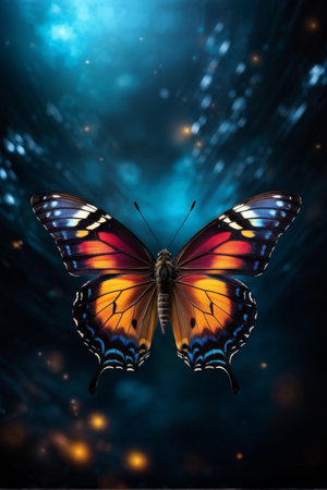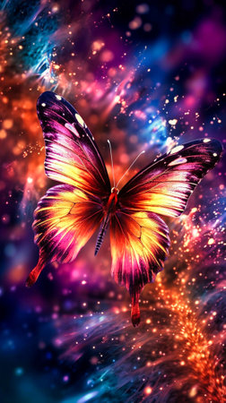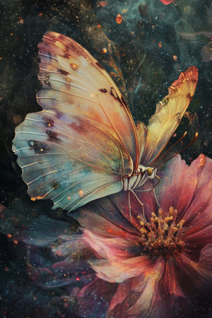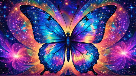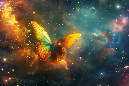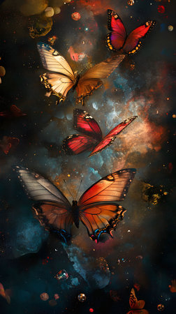 Four vibrant butterflies soar through a cosmic dreamscape. A surreal blend of nature and space