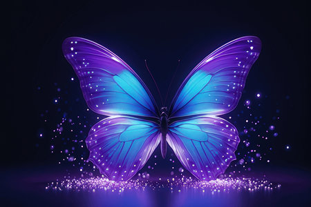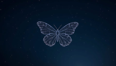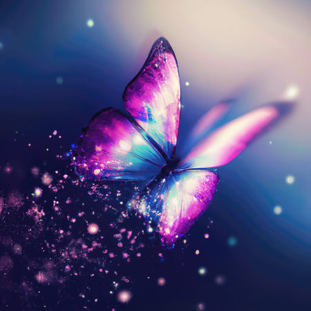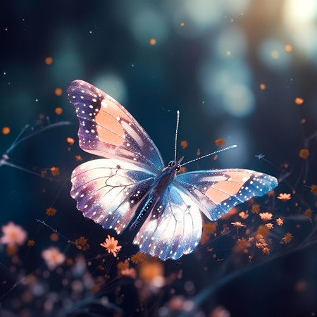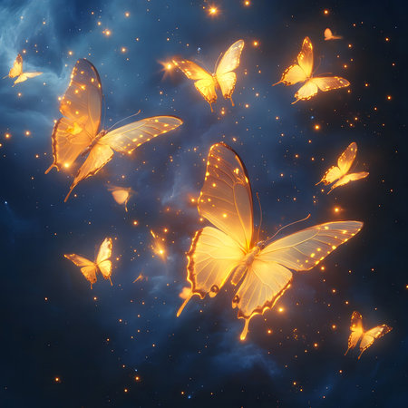 Glowing butterflies flutter through a starlit night, creating a magical, dreamlike scene.