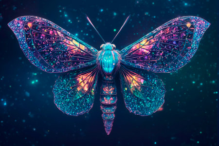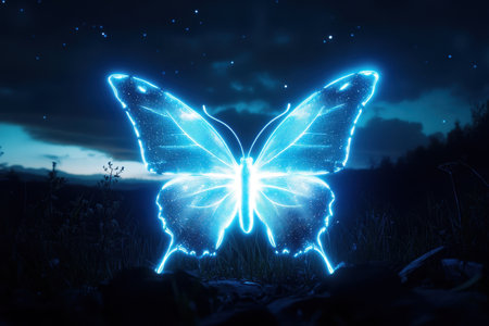 A radiant butterfly glows against a dark sky, creating a magical atmosphere in a quiet landscape.