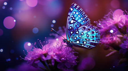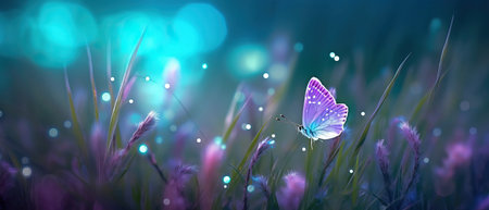 Butterfly in the grass on a meadow at night in the shining moonlight on nature in blue and purple tones, macro. Fabulous magical artistic image of a dream, copy space.