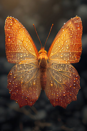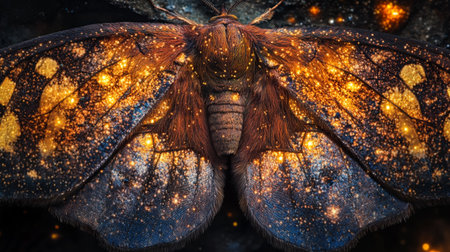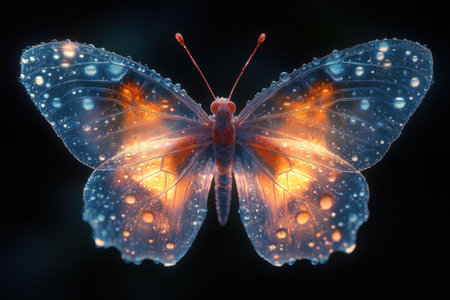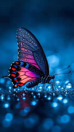 A stunning close-up of a butterfly at night, its wings adorned with water droplets, set against a dark blue, bokeh-filled backdrop.