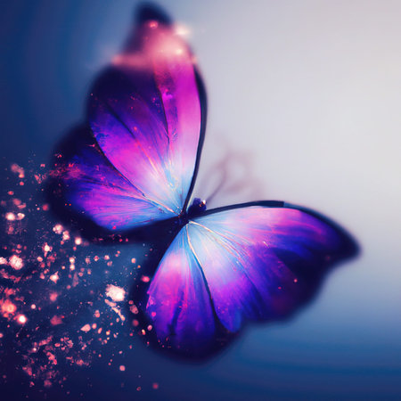 An iridescent butterfly moves gracefully in a soft, blurred background during twilight hours.