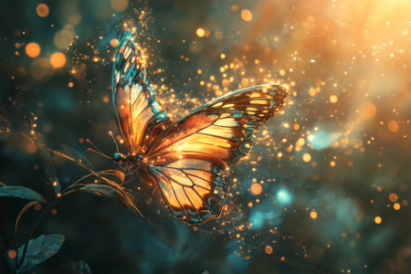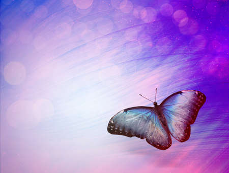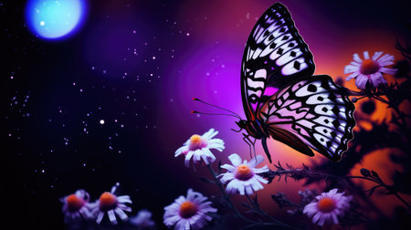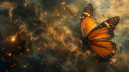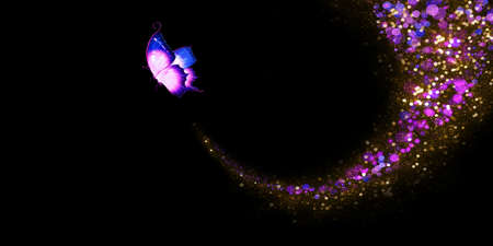 Flying delightful butterfly with sparkle and blazing trail flying in night sky among shiny glowing stars in cosmic space. Animal protection day concept.