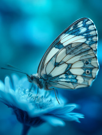 A close-up showcases an intricately patterned butterfly resting gently on a colorful blossom, set against a calming blue backdrop that evokes peace in nature?s harmo