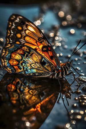 A breathtaking macro photograph of a butterfly near water with its reflection