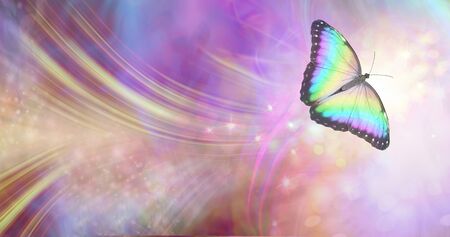 Feminine Multicoloured Butterfly Message Banner - a beautiful unique colourful butterfly floating off to the right against a wide bokeh pastel coloured background and copy space