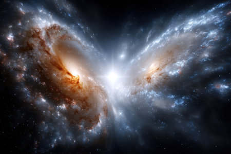 Two galaxies collide in a dramatic cosmic event, showing brilliant gas clouds and vibrant colors in space.