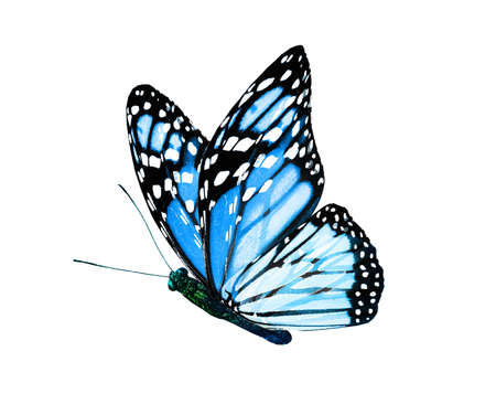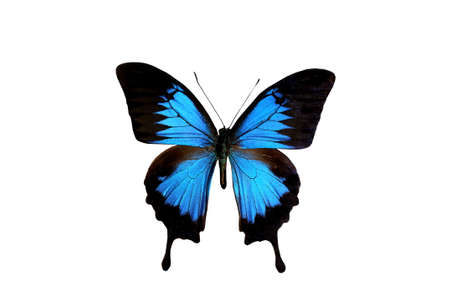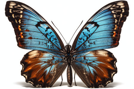 Blue butterfly isolated on white background. Exotic tropical morpho.
