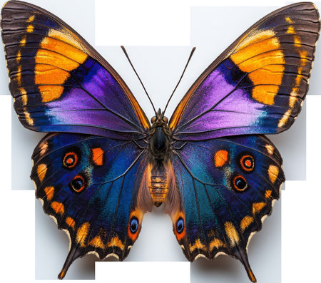 A stunning butterfly showcasing vibrant shades of blue, yellow, and orange in flight. The intricate details of its wings stand out beautifully on a transparent background, ideal for design or