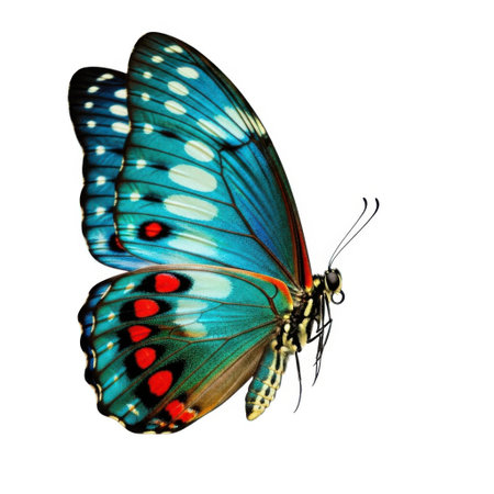 A stunning close-up captures the iridescent beauty of a butterfly, showcasing its detailed wings with captivating blue, green, and red hues. A symbol of transformation and natural wonder.