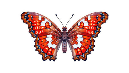 Vibrant butterfly with detailed wings, showcasing a beautiful combination of orange, red, and black markings. The butterfly's wings are spread and display a intricate pattern. Its delicate texture is clearly visible. The image is a close-up, highlighting the textures and intricate patterns.