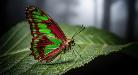 Macro shot of a beautiful butterfly on a green leaf in nature