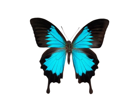 Blue butterfly isolated on white background. Close-up of butterfly wings.