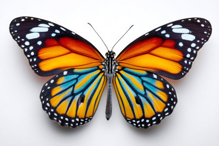 Plain tiger butterfly with spread wings showing orange, black, white and turquoise colors on a white background