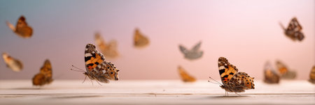 Butterflies move through the air with a soft pastel backdrop, creating a simple scene of nature in a warm setting.