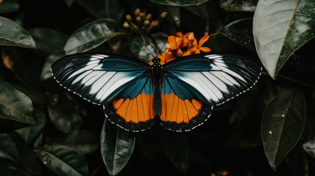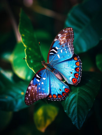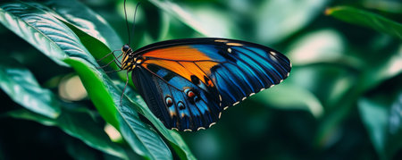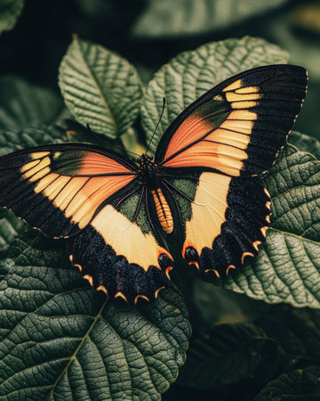 A close-up view of a vibrant butterfly resting delicately on a green leaf in its natural habitat