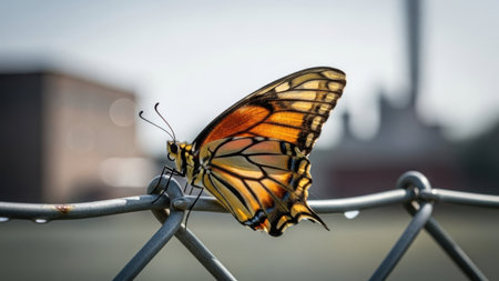 Monarch butterfly resting on a fence, showing its vibrant orange and black wings. Butterfly is on a metal fence with raindrops, urban setting, natural beauty.