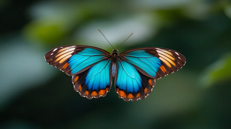 AI-generated A vibrant blue butterfly displays its intricate wing patterns against a soft, blurred green background.
