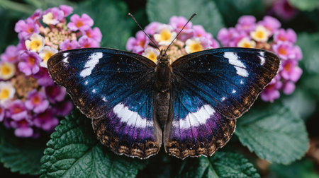 A stunning butterfly perched on vibrant tropical flowers, showcasing its colorful wings. This close-up captures the beauty and harmony of nature.